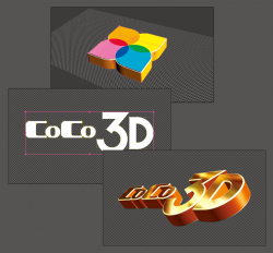 CoCo3Dで制作したテキスト、図形を一瞬で3Dオブジェクト化出来ます。単なる奥行き調整に留まらず、ベベル調整やグラデーション・テクスチャ等多彩な装飾編集にも対応しているため、表現力に富んだ3Dオブジェクト制作に貢献します。