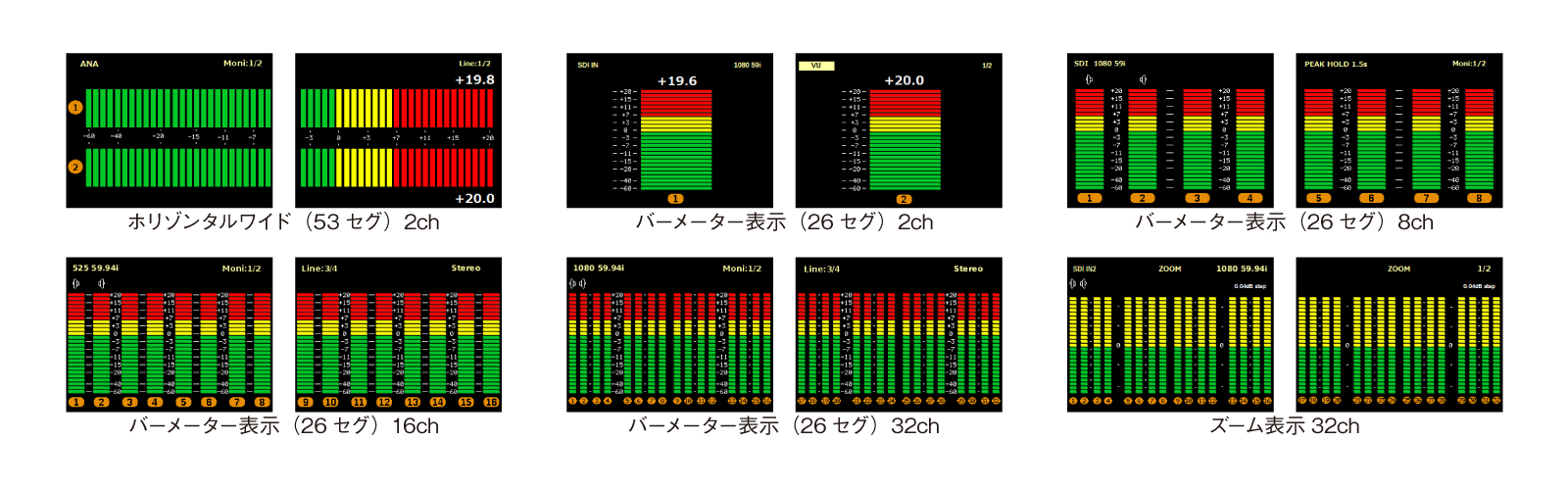 VU/ピーク/ピークホールド/ズーム(0dB中心に0.04dBステップ)表示切替 1~32ch/1~16ch/17~32ch/2chホリゾンタルワイド/2ch表示切替 |