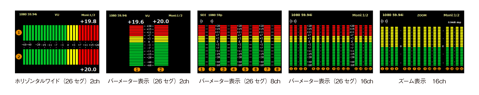 VU/ピーク/ピーク・ホールド/ズーム(0dB中心に0.04dBステップ)表示切替 2chホリゾンタル/2ch/1~8ch/9~16ch/1~16ch表示切替 |