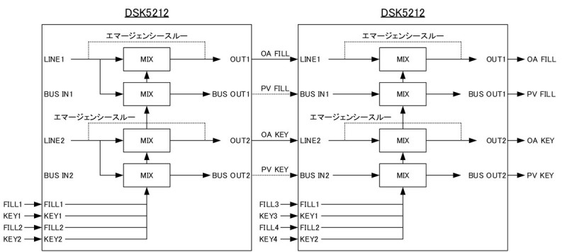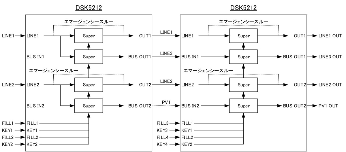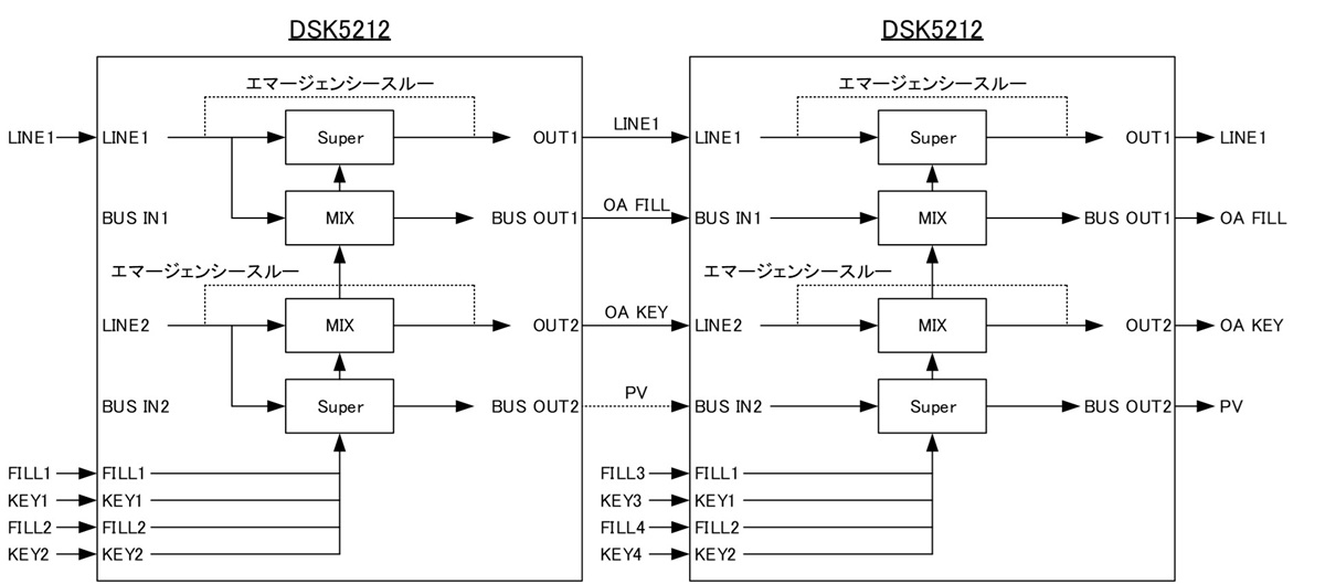 ・単体使用のDSK5102 は、2ch のスーパーミックスができ、カスケード接続可能なDSK5112 は最大10 モジュールをカスケード接続することにより20ch のスーパーミックスが可能です。