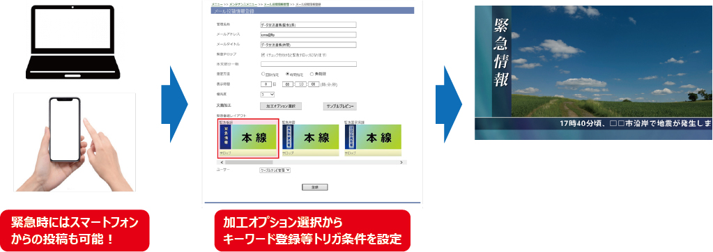 また、ケーブルテレビ様のデータ放送(ニュース、天気予報など)の投稿情報との XML ファイル連携により、L 字放送による緊急情報を迅速に視聴者に伝達、通常時からのデータ放送を災害発生時にも活用し易くすることにより、防災・減災に貢献します。